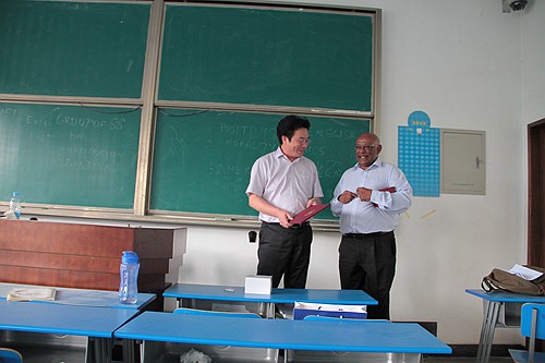 聘请Sornarajah为我校客座教授的仪式在其授课结束后隆重举行。我校法学院院长单文华教授为Sornarajah教授颁发了聘书并为他佩戴校徽。