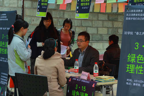 为加强大学生消费维权意识,提高大学生的法律素养,法学院研究生会联合法律爱好者协会和陕西稼轩律师事务所的专业律师,于“3•15国际消费者权益日”当天,在康桥苑西广场和西食堂门口举办了主题为“绿色消费、理性维权”的普法宣传咨询活动。