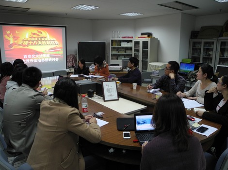 11月20日晚8点,法学院举办了学习十八大报告法治思想研讨会,由学院副院长、知识产权研究中心主任马治国教授、李晓鸣讲师组织,部分博士、硕士参加。