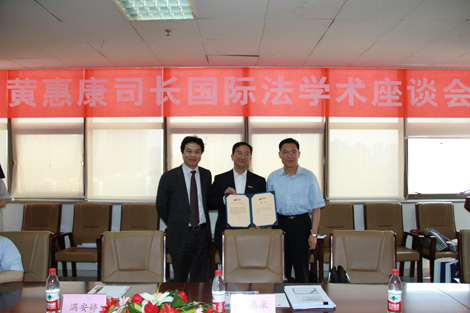 2012年5月26日,外交部条约法律司黄惠康司长“郑和研究员”授聘仪式暨国际法学术座谈会在法学院910会议室举行。千亿球友会党委常务副书记王小力教授、法学院党总支书记彭沪生老师、对外经济贸易大学石静霞教授以及丝绸之路国际法与比较法研究所骨干教师和学生代表参加了授聘仪式和座谈会。会议由法学院院长兼丝绸之路国际法与比较法研究所所长单文华教授主持。