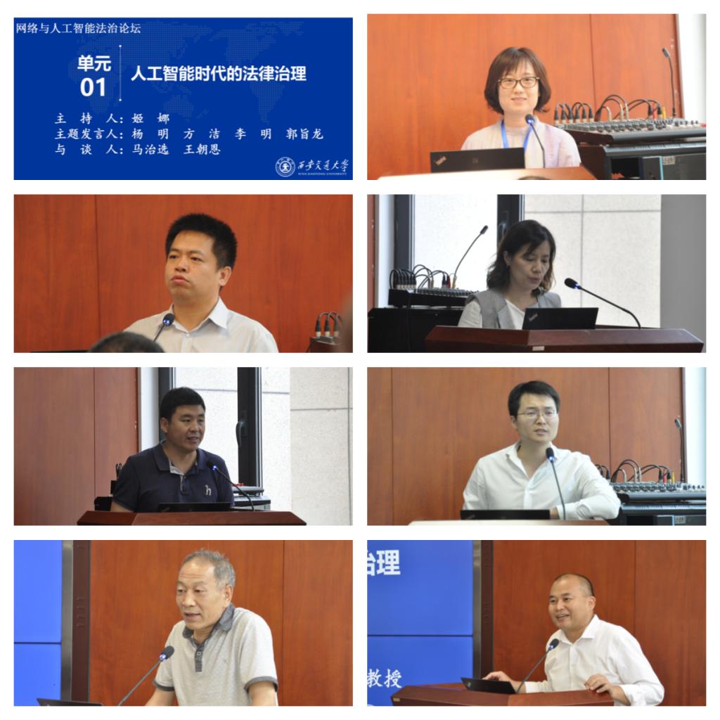 论坛由四个单元组成。第一单元“人工智能时代的法律治理”,由国防大学政治学院(西安校区)军队司法工作系姬娜副教授主持。北京大学法学院教授、互联网法律研究中心副主任杨明以《数据驱动时代的法律规制》为题,分享了数据驱动竞争的经济内涵,并讨论了数字驱动竞争中行为的可规制性。浙大城市学院法学院常务副院长方洁副教授结合自己长期担任杭州市人大法制委员会委员的经历,以《城市大脑赋能城市治理促进条例》的立法过程为例,阐明“善治下的立法的产生应当来自民众的真实需求”,为智能城市治理选择提供参考。西北政法大学博士生李明聚焦网络反恐,提出完善立法、加强国际合作、强化反恐人才培养等多方面对策。中国政法大学网络法学研究所郭旨龙老师从科幻文学中的机器人法则入手,提出其对人工智能法学研究的可借鉴性与局限性,开启了与会人员之间的“头脑风暴”。与谈人西北政法大学马治选教授及千亿球友会法学院王朝恩副教授分别对四位发言人的学术报告进行点评,并提出了自己关于人工智能时代城市治理、人工智能法律规制的见解。