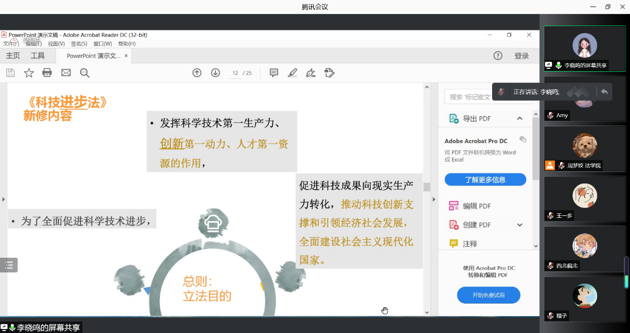 2022年1月9日晚上,千亿球友会法学院知识产权研究中心李晓鸣副教授对修订后的科技进步法的背景、新旧科技进步法的内容进行了对比,并对新科技进步法的亮点进行了详细介绍。同学们表示收获颇丰。