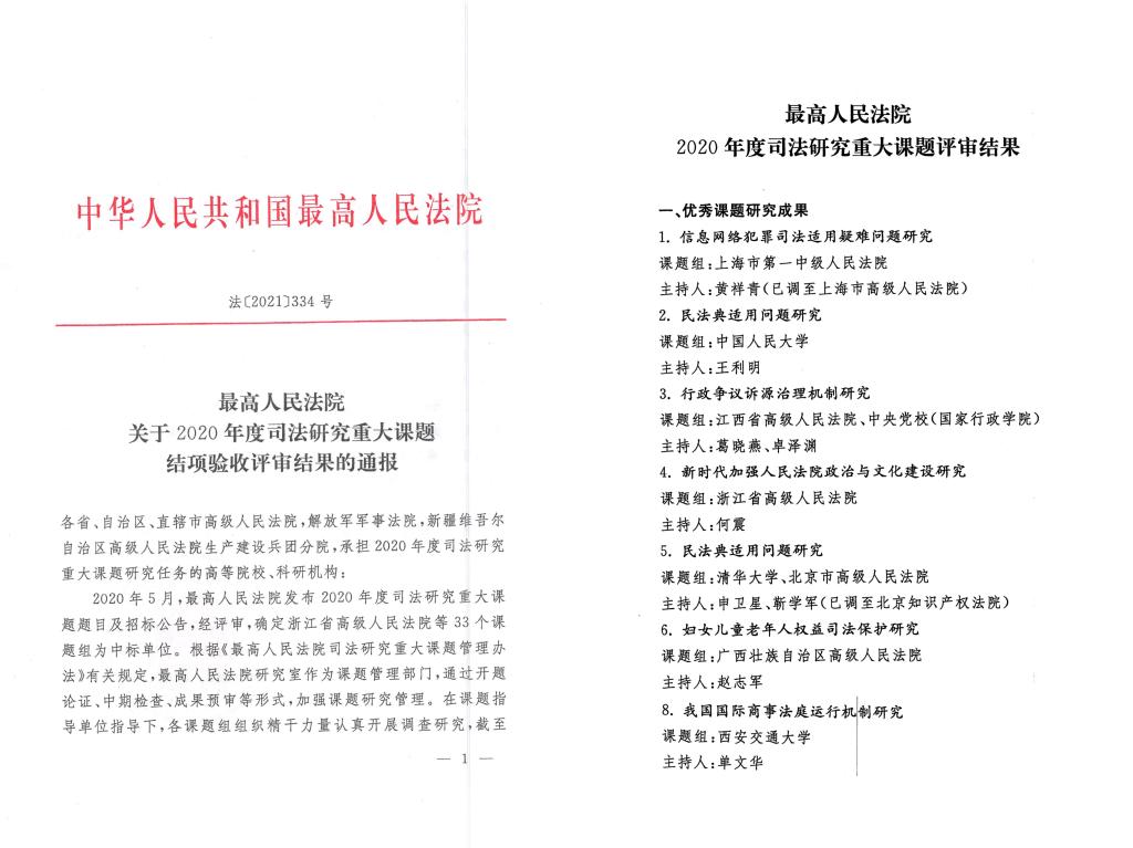 2020年5月,最高人民法院发布了2020年度司法研究重大课题题目及招标公告,经评审,确定千亿球友会单文华教授课题组等33个课题组为中标单位。这也是我校获批的第一个最高人民法院重大课题。